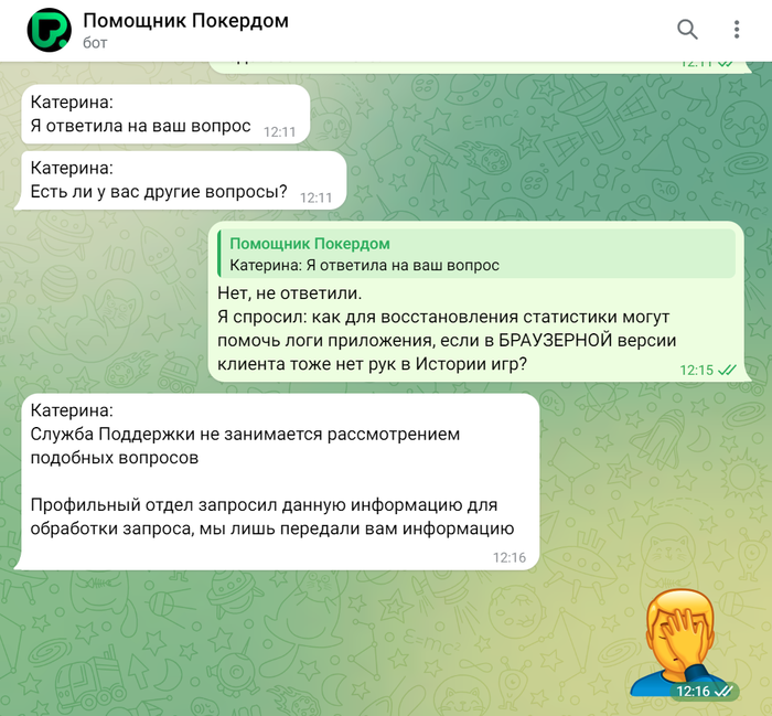 ПокердомКонсультант, в связи с этим вопрос.... а нахера вообще поддержка на сайте, на почте, в телеграм? Если она не работает и все вопросы решаются через форум.