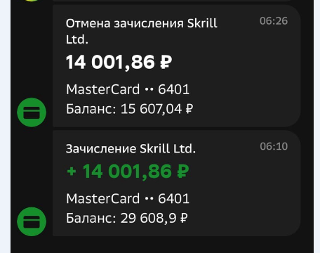 Гайс, случилась такая ситуация. Выводил деньги со Skrill на СБЕРБАНК, Карта скрилл долларовая а сбер рублевый мастеркард, пользуюсь таким методом уже более 2 лет и никогда проблем не было, деньги всегда заходят в течении 2х часов. В очередной раз вывел сумму 200$, но получилась такая штука, деньги на сбер пришли и через пол часа пришла смс "отменя зачисления Skrill Ltd" скину скрин, в заявке на скриле пишет что "выполнено" Позвонил в скрилл, там уведомили меня что скорей всего это банк удерживает по какой то причине средства, так как заявка успешно обработана в скрилле и они не при делах