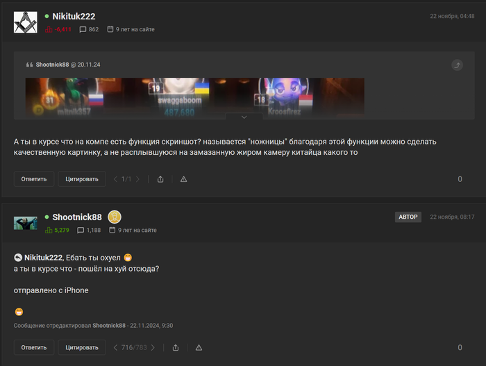 Ты называешь меня имбицилом, но при этом сам кроме оскорблений в рейтинг и оскорблений на замечание про жирную камеру на телефоне и что это попросту не смотрибельно и не уважительно к читателям твоего блога, на это ты ничего попросту не смог ответить кроме трех этажного мата. Так кто из нас имбицил? Кто из нас под водкой с мефедроном? Кто из нас дерьмо?