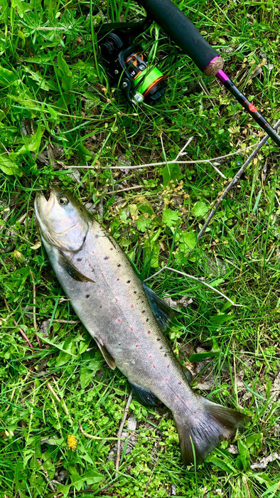 Поймал ручьевую форель на пол кг. Красная рыба из семейства лососевых. Ну для меня, для дилетанта, это как бы нихера себе!!!