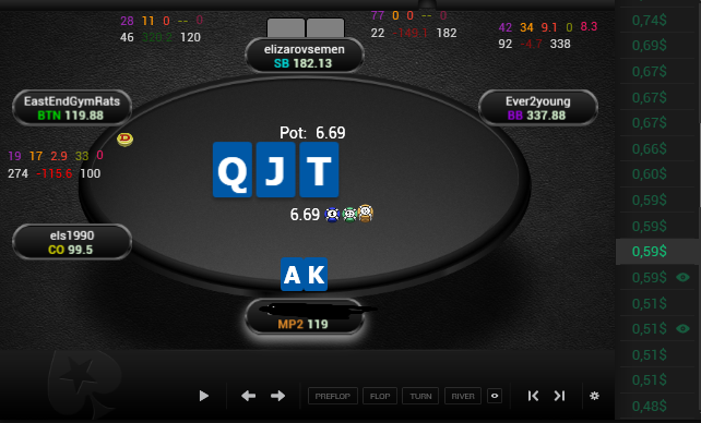 Да и сразу переапало, в первые 1,5-2 часа, потом как попустило, за час с небольшим минус 3,5 БИ, почти переап выровняло офигенными раздачками типа ТПТК в сквиз-поте не устояло против голого нижнего стрит-дро(выставились на флопе).