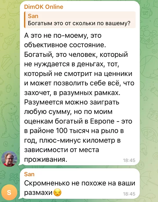 тут разговоры были по 3-5-10к в месяц. но если погуглить индексы неравенства, то получается, что 100-200к в год на семью, а даже не на человека, это уже значительно выше медианы в странах первого мира, которые сами по себе поставляют всего топ10% по миру. т.е. мы говорим где-то уже о топ3-топ1% по миру. надо, конечно, уточнять данные, но 100к на человека будет где-то внутри топ1%. при этом страны типа финляндии и норвегии, безусловно богатые и развитые, но в то же время и очень дорогие для жизни, что нивелирует ценность номинального дохода, систематически на первых местах в топе по уровню счастья населения. причем счастливыми себя там поголовно ощущают люди с доходами значительно меньше.