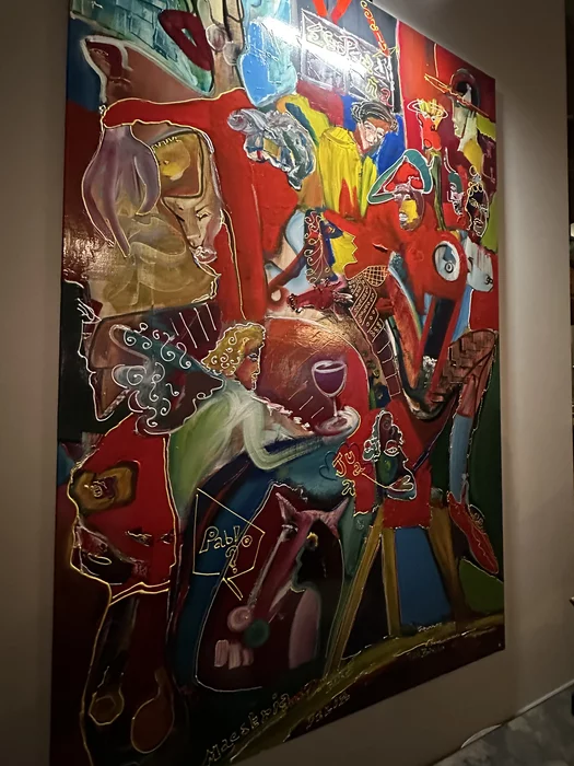 Картина, которая висела около нашего столика. Очень увлекательно было искать и находить имена и ссылки на Пикассо, Дали, Миро.