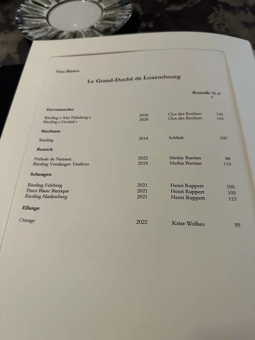 Ничего особенного, кроме одного забавного факта. Впервые в жизни столкнулся с тем, что красное принесли охлажденным и еще и поставили в ведерко со льдом. Попросил убрать лед, официант покосился, но исполнил. После этого еще сталкивались в Люксембурге с холодным красным, видимо это реальная местная фишка.