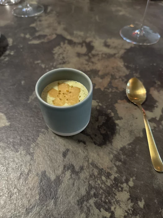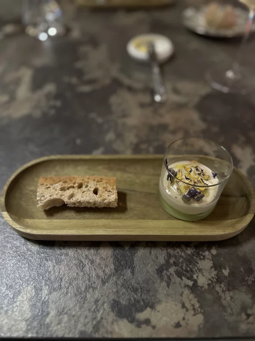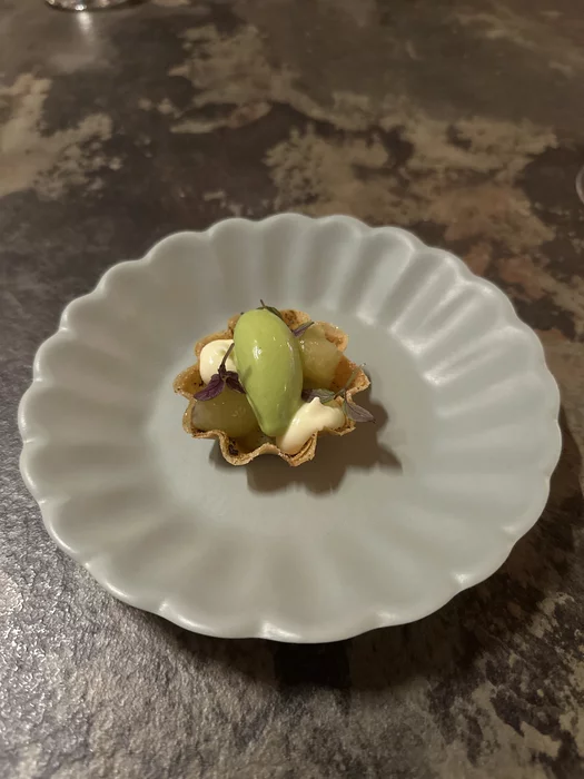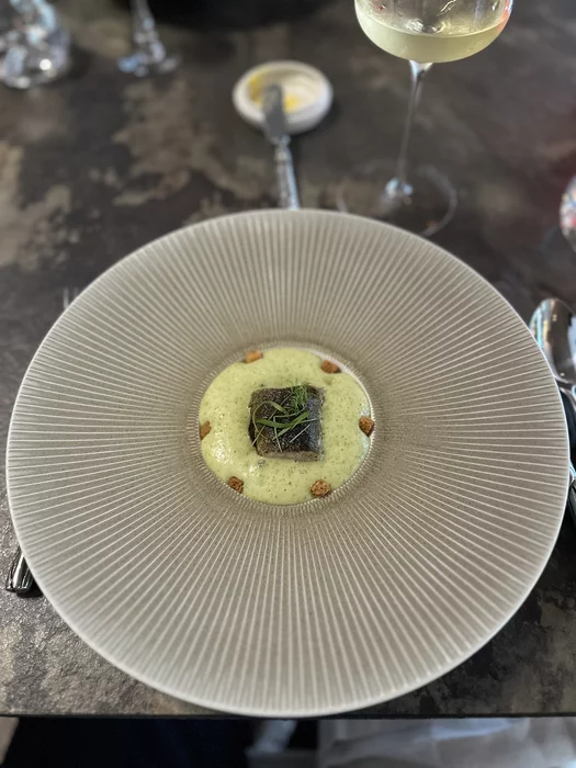 На первый стартер был мусс из зеленой фасоли с пыльцой их мелиссы. Что-то очень воздушное, неосязаемое, неплохое.
