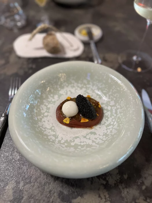 Вторым стартером оказалась бомба. Был заявлен томат с бурратой. Официант уточнил, хотим ли добавить черной икры (за отдельные деньги). Я почти автоматом готов был отказаться, ибо в последнее время в основном разочаровывался качеством даже в приличных ресторанах. На всякий случай поинтересовался откуда икра и получил неожиданный ответ - из Мадагаскара. В 2010х годах три француза завели там аквахозяйство, где выращивают белугу и осетра и поставляют икру по всему миру. Называется Rova Maison. Незамедлительно решили попробовать и не прогадали.
