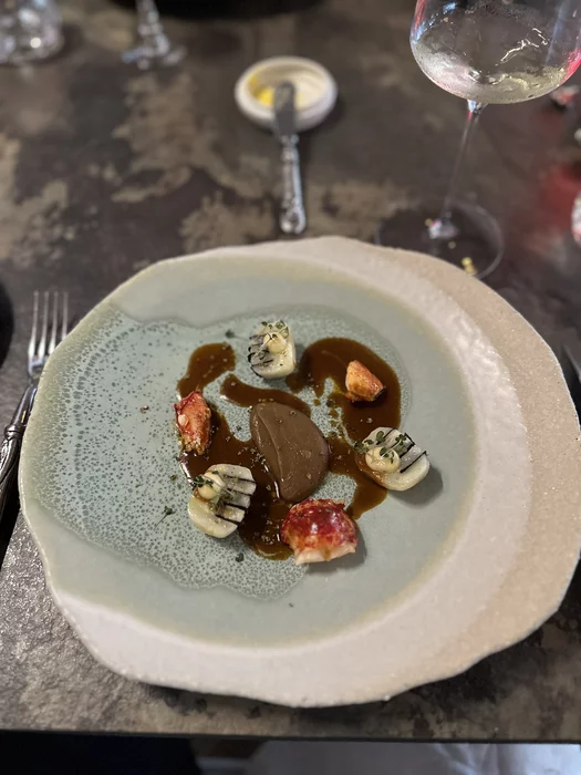 Далее был омар в перечном соусе и какой-то овощ, вроде редьки. Не опознал на вкус и не разобрал описание, даже со второго раза. Омар прекрасен, хотя соус чуть резковат был.
