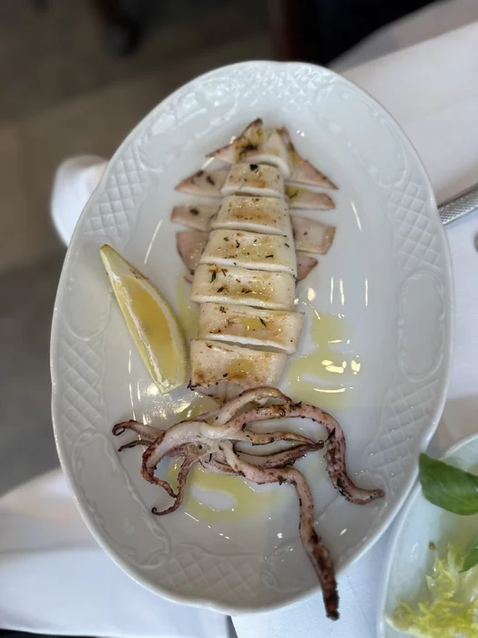Кальмар. Приготовлен идеально - никакой темпуры, в меру масла, не резиновый.