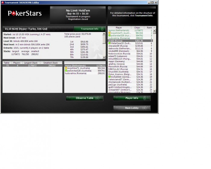 Poker Stars $1.00+$0.10 No Limit Hold'em Tournament - t150/t300 Blinds + t30 - 9 players -