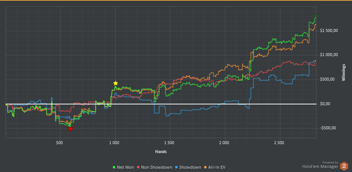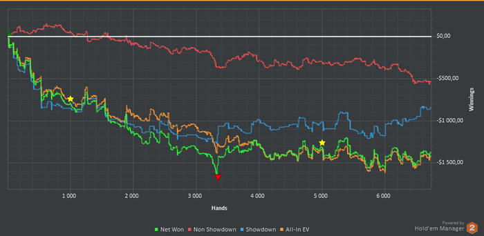 677к рук 5.2бб/100, вроде вполне неплохо, тут всё что я играл, от нл10, до нл100, причем последнего очень мало и в минус. Внимательный читатель мог заметить, что я писал про 4 месяца в минус, а по графику такого не видно. Во-первых этот график только со старзов, а еще было отыграно пару месяцев на пати, но я хз где эти руки сейчас, а во-вторых была стандартная картина, когда я тащил на лимитах ниже, а потом шел выше и все засаживал, и так много раз по кругу, поэтому в бб вроде и терпимо, а вот в $ печально.