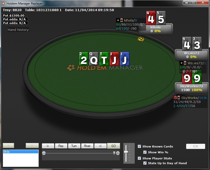 Два дня пидорил худ, создавал кастомные статы, чтобы отделить от статов 3макс хедсаповые, тестировал. Главное достоинство - не надо вводить фильтры для 2 и 3 игроков за столом, не надо переключать на кофихуд в хедсапе. И еще немаловажно - при переходе в хедсап статы не обнуляются, и мы в целом имеем представление об игре соперника. Для секции 3-макса статы только для 3макса (кроме LR - лимп рейза). Т.е. конский стил с СБ - не потому что вы с оппом много катали в хедсапе, где он много рейзил с баттона, а потому что он и правда конский. Собственно вот: Постфлоп и префлоп по глубине - взяты из кофи худа (который уже хз сколько времени валяется в свободном доступе, да и уже не самый лучший худ), 3макс - мои труды. Хочу за за худ 10 долларов с человека, но выложу только когда наберется 15 желающих. Пишите в личку (в скайп). И да, скоро планирую добавить чарты пуша для 3макса.