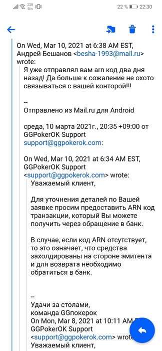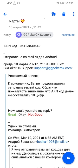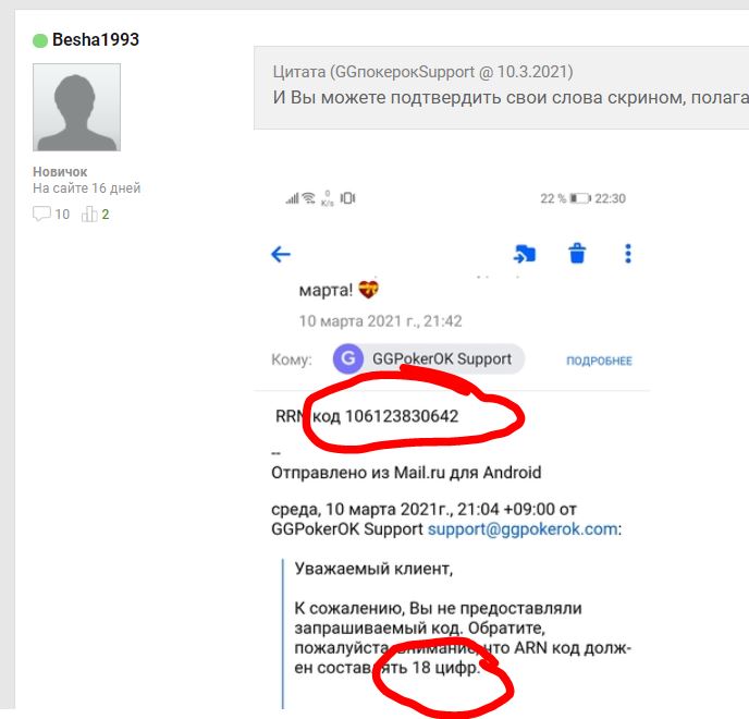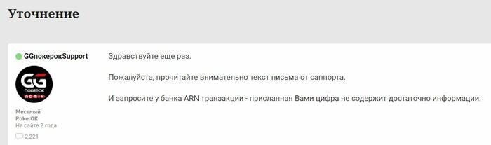 GGпокерокSupport @ 10.3.2021 Уважаемый Besha1993, я уже отправлял Вам в личку просьбу внимательно прочитать переписку с саппортом. Саппорт запрашивает у Вас ARN транзакции, который, как указано в переписке, содержит в себе 18 цифр. Вы присылаете набор из 12 цифр.