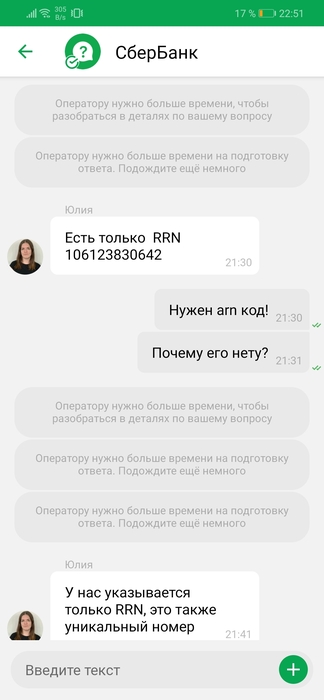 Уважаемый Besha1993, я уже отправлял Вам в личку просьбу внимательно прочитать переписку с саппортом. Саппорт запрашивает у Вас ARN транзакции, который, как указано в переписке, содержит в себе 18 цифр. Вы присылаете набор из 12 цифр.