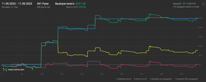 11.09.2025: 72 минут, 491 рук, nl50-100 +$320.
