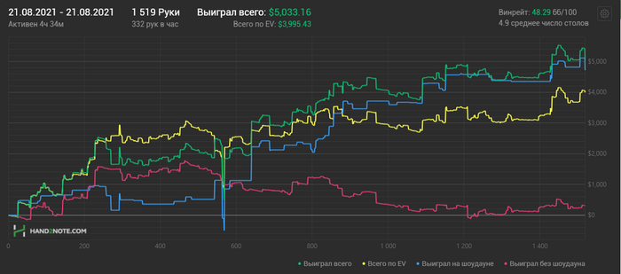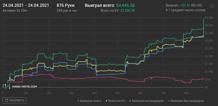 NL400-600 и немношко NL200, в реале получилось больше, около 6K + rakeback. H2N всё ещё теряет 5-10% рук. Всегда играю в 200бб+ стеках