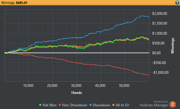 Selms, ну это у меня общий лузрейт. Тут надо смотреть каждую руку в отдельности или хотя бы небольшие группы рук, если выборка маленькая. Так то можно топ диапазона в +1000бб/100 разыгрывать, а низы в -1000бб/100, а общий иметь 0бб/100