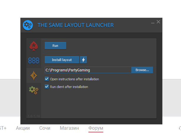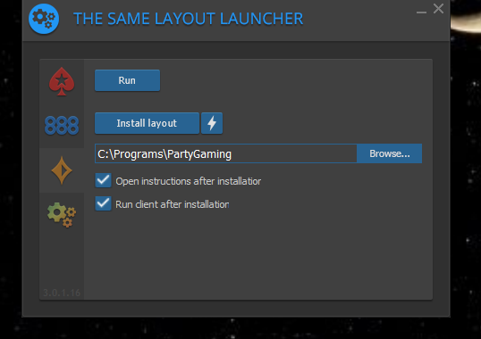 указываю вот это путь C:\Programs\PartyGaming\PartyPoker дальше установить лейаут и на этом все. запустить кнопка тоже не работает.