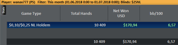 Ближайшие цели на профит не ставлю, одна из основных целей на данном этапе, показать винрейт 10bb/100 на дистанции 100К нл25, а дальше посмотрим...