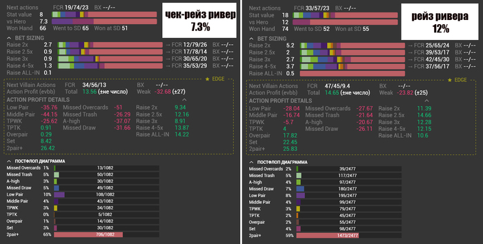 Рейзы и чек-рейзы флопа Я взял на себя смелость анализировать рейзы и чек-рейзы именно на основе общего беттинга, а не цбетов. Мои предположения основываются на том, что нам не сильно важно в какой именно мы были ситуации (открылись и цбетим COvsBB или зашли под сквиз от фиша и получили чек-рейз). В вакууме также не очень большое значение имеет была ли за нами агрессия или нет, так как агрессия в любом случае будет за нашим клиентом)) Исследуемая группа имеет чек-рейзы максимально приближенные по цифрам к значениям чек-рейза не очень агрессивного регуляра. Почему? Это абсолютно очевидно, так как у игрока помимо чека была опция бетнуть(иногда донкнуть). То есть фактически наш оппонент стоял перед трудной задачей сплита своего не всегда сильного ренжа на три опции - донк, чек-рейз и чек-колл Смотрим что в чек-рейзе и сравниваем с рейзами Визуально, не смотря на то что общая цифра чек-рейза маленькая, диапазон выглядит не слишком сильным В подтверждении моих слов выступает цифра WonatSD after CH+R = 44%, что, безусловно, мало Процентно слабо выделяются допперы+ и топпары со слабым кикером. После чек-рейза мы получим бет в 63% случаев (если коллим, то готовимся встречать второй баррель). После рейза еще чаще 76% Хорошей стратегией будет ререйзы с топовыми и премиальными уязвимыми руками, выбрасывать против ререйза наша ЦА не любит: фолды на ререйз флопа 27 и 28% соответственно. Общая цифра рейза более чем в два раза больше по сравнению с ч-р - но диапазон - как брат близнец) Выигрыш на вскрытии 42, на 2% меньше Это связано с тем, что в ситуации рейза диапазон донка конструировать больше не нужно, и часть из него отправилась на битву рейзом Также можно сделать вывод, что никакой зависимости от сайзинга рейза оппонента мы не наблюдаем, диапазон примерно одинаковый, что от плоскача, что от 5х (думаю что в исследовании пассивных рекреационных оппонентов будут другие данные)). Частотность сильно смещена в сторону 2x рейза. На втором месте 4x-5x сайзинг, но как мы видим их наполнение практически идентично (в бОльшем сайзинге даже чуть больше воздуха)