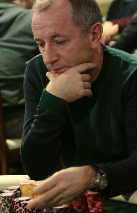 Победитель главного турнира Андрей Баранюк в прекрасном расположении духа. Кстати, как и в победном турнире, он вылетел в первый стартовый день, но потом раскрутился с реэнтри во второй, - и уже помышляет о второй финалке. Стол у него тяжелый - непосредственно слева от него сидит Денис Кораблев и Булат Бикметов, но Андрей хорошо знает себе цену, и что надо делать, чтобы добиться результата.