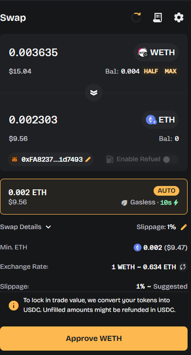Сначала будет «Approve WETH» (спишет немного MNT).