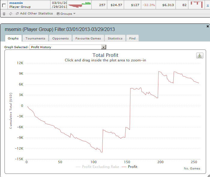 Читаю дневники коллег - смотрю: опять пошли споры о дисперсии и даунстриках, некоторые свято верят, что такого не бывает. "И я была девою юной", но, к счастью, жизненный опыт позволил воспринять спокойно "забавный" стрик на 110 турниров в марте. Причем, если я и не всегда играл в свою А+ игру, то уж точно никогда не действовал хуже, чем на 4-. Итоговый результат месяца (а с 95% уверенностью могу предполагать, что в марте я уже не возьму виртуальные фишки в руки) на фоне его старта вполне удовлетворительный. Хотя, конечно, после ударного февраля хотелось бы большего.