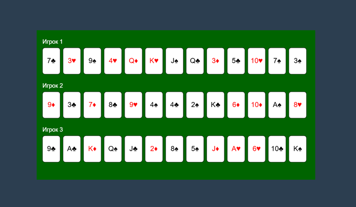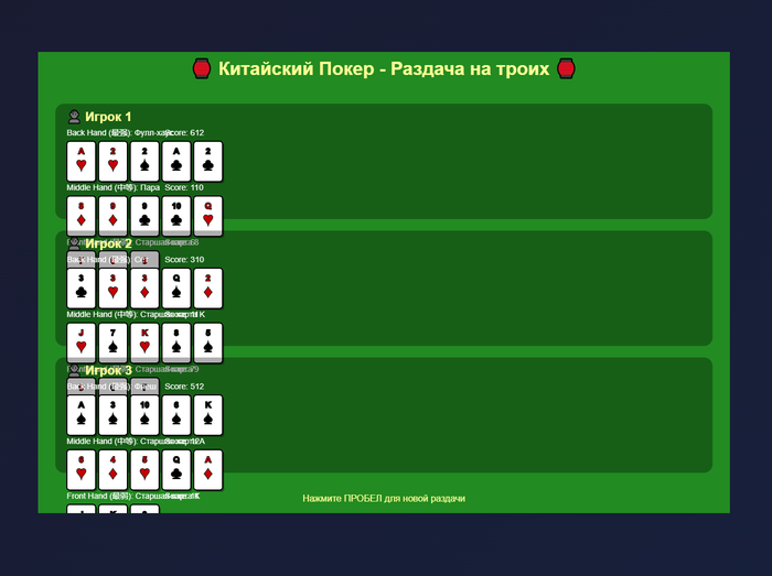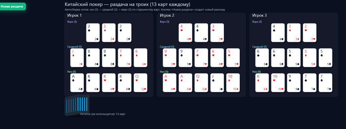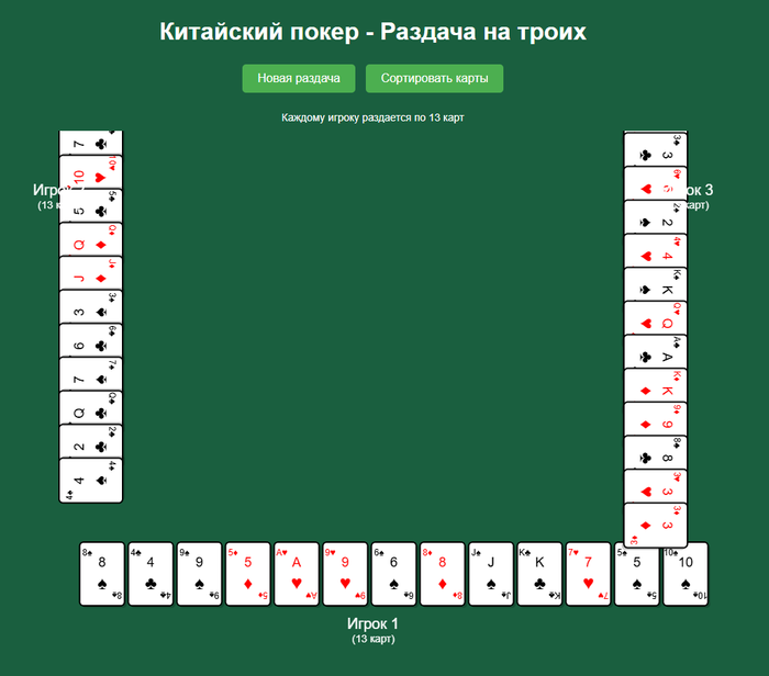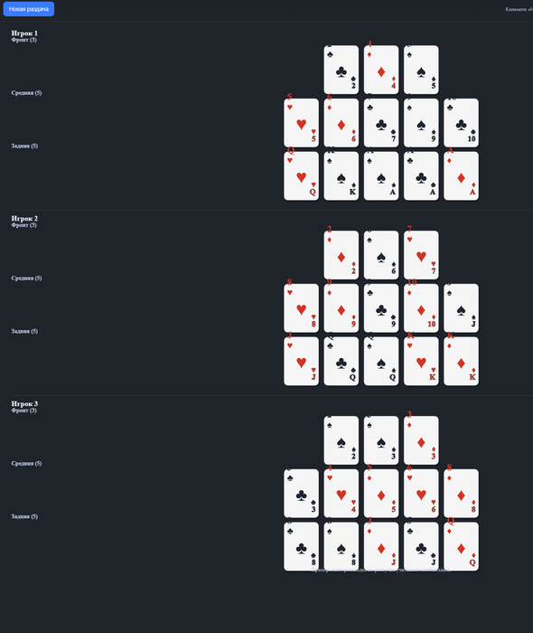 сгенерируй пример раздачи в китайский покер на троих на p5.js в одном html файле