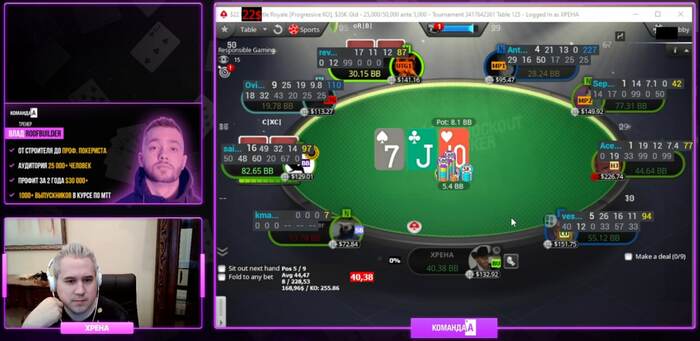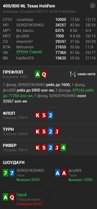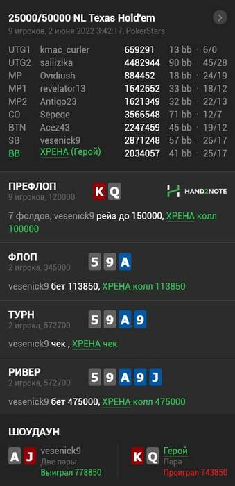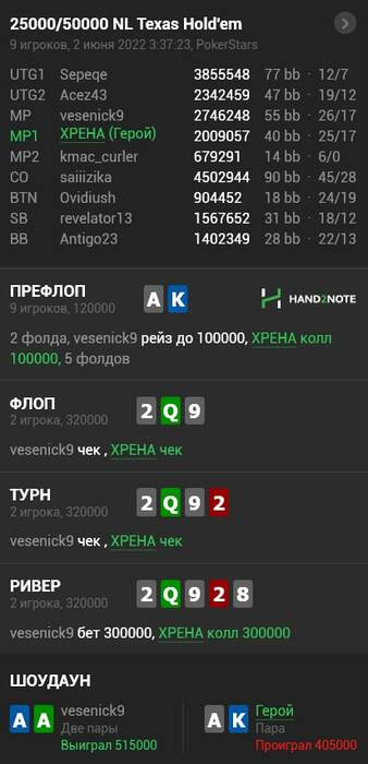 Те же люди, та же история, но тут мы платим 3бб на флопе и 9бб на ривер, на финалке, в Ноке((