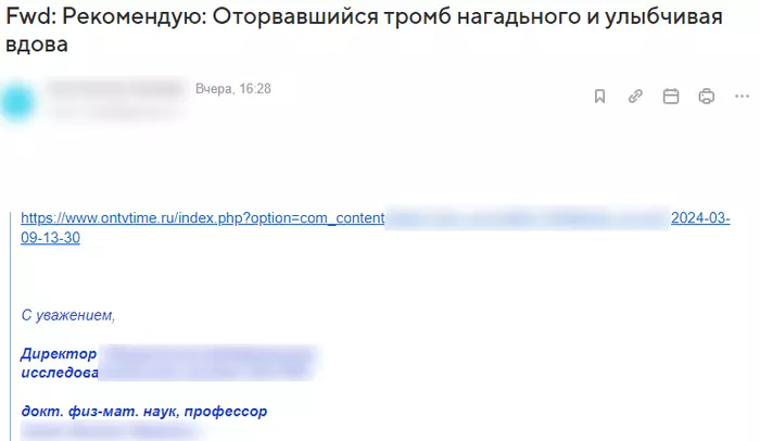 Забавно в этом то, что мало кто воспринимает всерьез его эти ссылочки, которые происходят аккурат в праздничные дни, когда в их кругах принято бухнуть (и он частенько это делает, что иногда сказывается на его присутствии на рабочем месте, подпись не получить). Вот даже зав отделом ИТ разослал перед праздниками всем предупреждение, что возможны провокации. Прямым текстом: не открывайте, даже если это от других сотрудников (он же не может написать прямо, но всем и так понятно, потому что руководитель - единственный кто так делает), это все hlam.