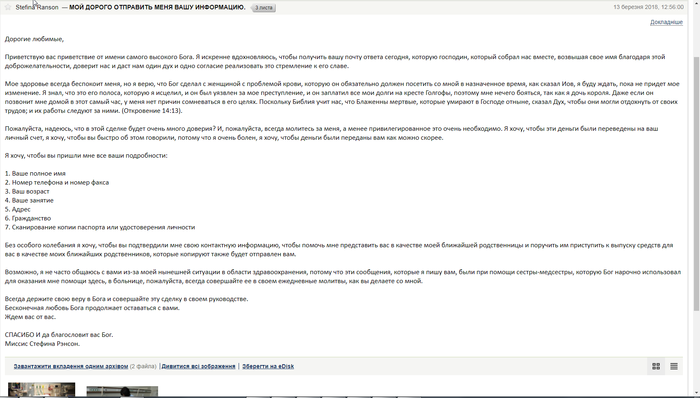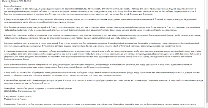 Я понял что это развод ещё сначала, мне стало интересно как далеко зайдёт дело, но после второго письма, интерес пропал и стало просто омерзительно противно. Мне вот интересно, те кто это написал, вы люди вобще? Прикрываясь больными, Библией.....Я просто желаю вам пережить тот ад и ту боль, которую переживает несчастная женщина, фото которой вы мне отправили и мои мучения, больше ничего....