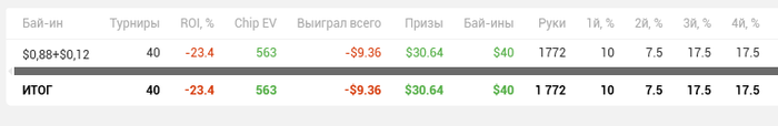 ubelousov, просто вместо тысячи слов. Вот примерно любой мой подход, не важно 10 турниров сыграл или 110, по 6 столов или 20. Разница только в количестве недобора. Поэтому лимиты я могу побить только депозитом, который делать в ближайшее время не собираюсь. Сегодня вывел всё, кроме 30$. Если и это залью - отдохну от покера несколько недель или месяц. Сегодня, кстати на удивление играл хорошо. Боюсь представить как бы закончил, если играл