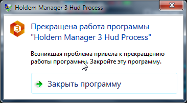2) После долгой игры начинает выдавать ошибку "Прекращена работа программы "Holdem Manager 3 Hud Process"" и просит закрыть HM3, что можно с этим сделать? У всех так? Hud стоит Cash - HM3 Standart. Винда Windows 7 64bit.