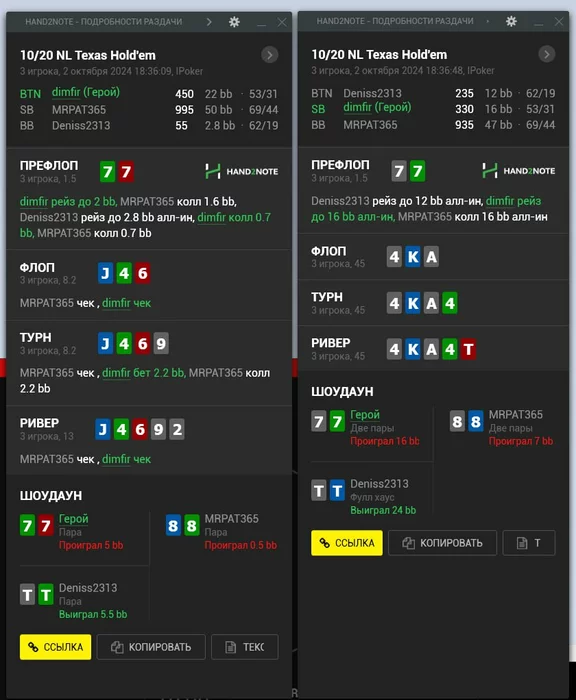 Вот еще менее вероятное событие, один и тот же турнир, через раздачу)