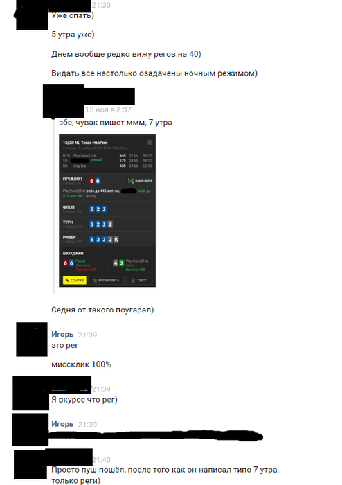Очень весело читать от play2win$0k предъявы на тему морали, когда парень у меня уже 1.5 года висит с заблокированным чатом на старзах, т.к. постоянно пишет в него всякую грязь и дичь, обзывает своих оппонентов как хочет. Вот теперь до Сторо докопался, уличая его в нытье. А по-поводу того, что про сторо много регов якобы говорят, будто бы он слабый - вообще топ контент, походу люди из той же лиги высокоодаренных людей, которым просто не повезло, что у них по жизни даунстрик. Открою тайну: про тебя так тоже говорит каждый второй, кого я знаю, зато про Сашу такого не слышал. Сам в себе не уверен ни черта, вот и докапывается до всех. Теперь Токсик показал еще всем свое настоящее лицо публично, такие каминг-ауты - бесценны. Play2loose предлагал раздачки скинуть, как Александр плохо играет. Возвращаю должок за грязь в чате, на которую я просто всегда реагирую молчанием и блокировкой . Я предлагаю кое-что по-круче, моя переписка с моим другом, регом 40ого лимита, датирующаяся 15.11.2019. Когда хиро видит двух регов за столом, он предпочитает играть в пуш эни ту, видимо поныть в чат перед пушем с такой монстр рукой было психологической уловкой, которую он вычитал где-то на западных засекреченных форумах, там же где и прочитал, что Сторо фиш и что кидать публичного человека, который пошел тебе на встречу, а потом провоцировать его на конфликт - топ страта.