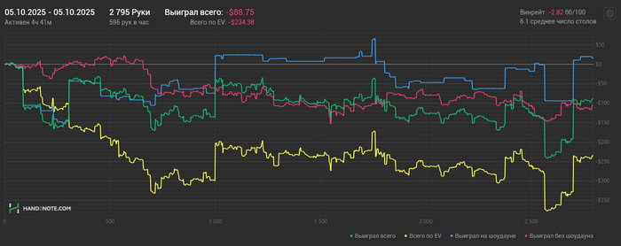 Сегодня и столы были не очень, и в префлоп олынах с фишерегами я только в АА выставлялся, ну это ладно, ещё и сам играл отвратительно, много залил на постфлопе на хироколах, так что заслуженный минус сегодня.