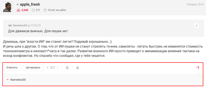 И речь шла о другом. О том, что от ИИ пушки не станут стрелять точнее, самолеты - летать быстрее, не изменятся стоимость тоннокилометра и киловатт*часа и так далее. Развитие военного ИИ просто приведет к минимизации влияния тактики на исход конфликтов. Но спасибо что сообщил, где у тебя чешется.
