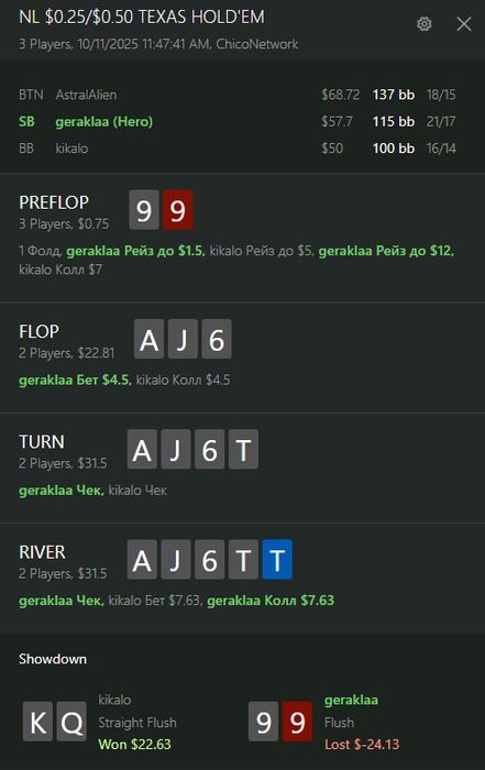 gerakla @ 11.10.251) Экшена много сегодня было, и таймбанки на чико маленькие, из-за этого в ХА с регом на ривере фигню сыграл, тут надо самому всегда блокать, а не чек-колл играть, итога бы не поменяло, конечно, такую руку нельзя не оплатить хоть немного.