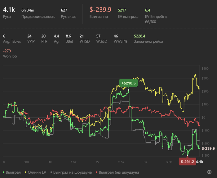 Очередные почти $500 недодачи за день на nl50-100. На графике всего $300 недодачи, но эту раздачу тоже надо учесть, мы выставились по факту на тёрне с випом, просто случайно у него в стеке осталось 7бб, когда ему доехало, и ев написало 0%. Месяц уже в минусе по профиту, по ев в плюсе, недодача стеков 30+ за две с половиной недели. Ну жду просто, пока отпустит.