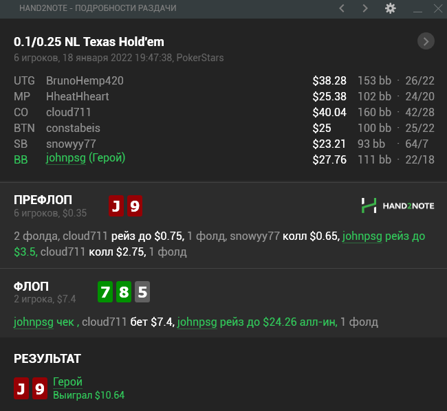 Rainpwn, согласен, я поначалу и не хотел сквизить. Потом глянул, что фолд на сквиз как ни странно 70% у него (правда на деле оказалось меньше, но все равно больше 60). Короче решил сквизнуть. Да там по ев скорее всего +- равнозначное решение.Это типичная ситуация для тайтового игрока-когда хочется сыграть агрессивно-ничто уже не остановит))