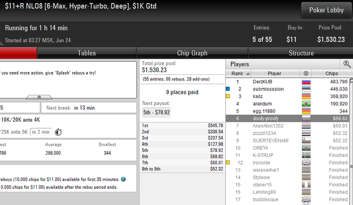 Сегодня как-то так. Ссыграю еще ночные и пойду спать. Не понравилась раздача в 27-ом кноке. Отдался как долбанный фиш. Так в целом играл неплохо, но можно лучше. Всем спокойной и удачи.