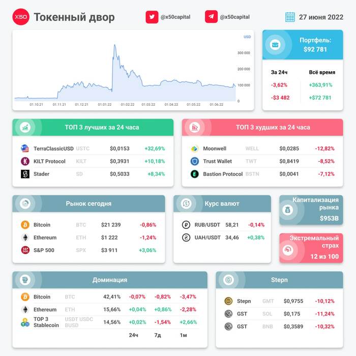 - ТОП 3 лучших/худших токенов из портфеля за последние 24 часа