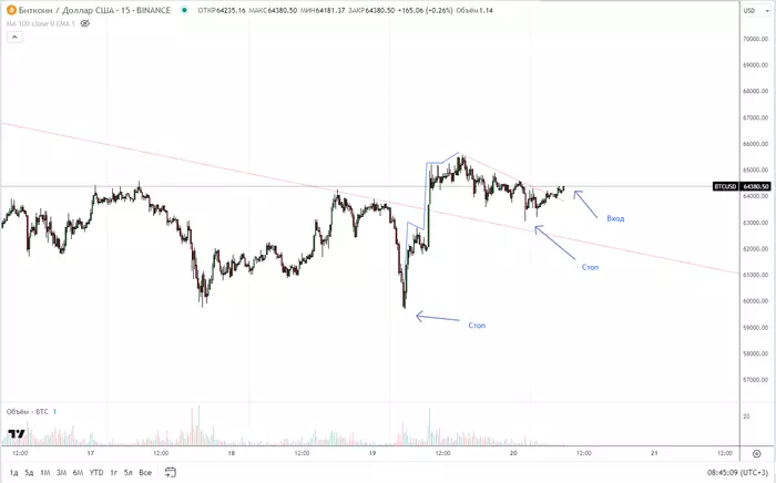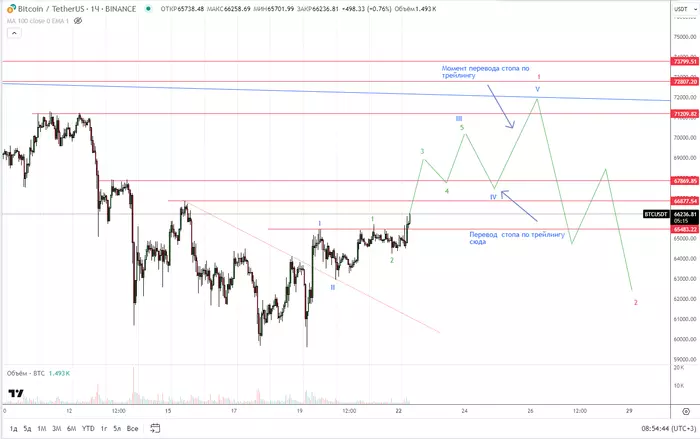Теперь к этому конкретному трейду и картинкам. Если мы зашли практически по лучшей цене 64к и поставили стоп ниже 63к. То при торговле по волнам стандартный перевод в б/у, когда мы пересекаем верхний лой 65450. Потому что есть риск того, что это будет не 5-волновка, а тройка и после закола хая мы полетим вниз ниже 60к. Также есть риск, что это более сложная коррекция и мы в рамках предыдущего импульса на М15 не пойдём ниже ниже 60к, но можем обновить лой 63к и наш стоп выбьет. Учитывая, что на графике есть микро трендовая, логично поставить стоп в районе б/у после пересечения локального хая ниже неё