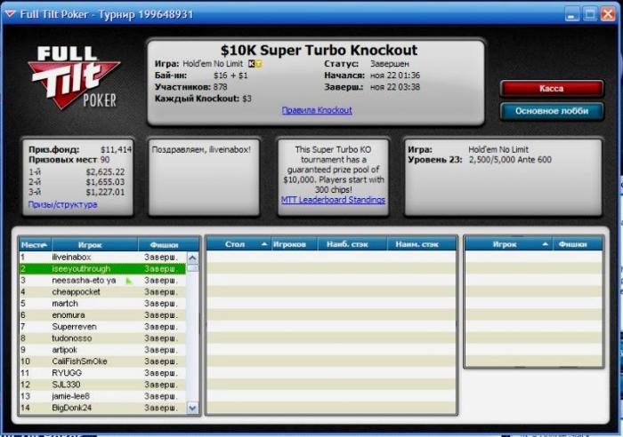PokerStars Турнир №340010285, Безлимитный Холдем Бай-ин: $5.00/$0.50 USD 2777 игроков(а) Общий призовой фонд: $13885.00 USD Турнир начался 19.11.2010 17:00:00 MSK [19.11.2010 9:00:00 ВВ] Турнир завершился 20.11.2010 1:45:40 MSK [19.11.2010 17:45:40 ВВ] 1: ALI_G8989 (Владивосток), $1745.92 (12.574%) 2: oshkarito (Gurevsk), $1771.05 (12.755%) 3: Cuban88 (Харьков), $1469.67 (10.584% Решили поделить))Хотя я не хотел был чип лидером((Но была долгая сессия и к глубокие стеки((Короче не оптимальное состояние)))Хотя сейчас жалею мое было поле(((Но так всегда)))
