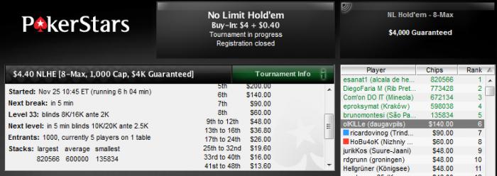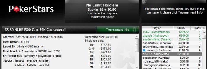 PokerStars Турнир №334104058, Безлимитный Холдем Бай-ин: $2.00/$0.20 USD 180 игроков(а) Общий призовой фонд: $360.00 USD Турнир начался 22.11.2010 13:24:58 MSK [22.11.2010 5:24:58 ВВ]