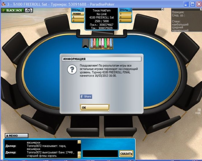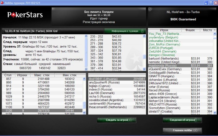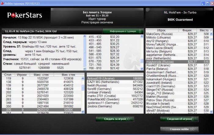PokerStars Турнир №696869338, Безлимитный Холдем Фриролл 25000 игроков(а) Бонус к призовому фонду от PokerStars: $1000.00 USD Общий призовой фонд: $3053.80 USD Турнир начался 14.03.2013 23:00:00 MSK [14.03.2013 15:00:00 ВВ]
