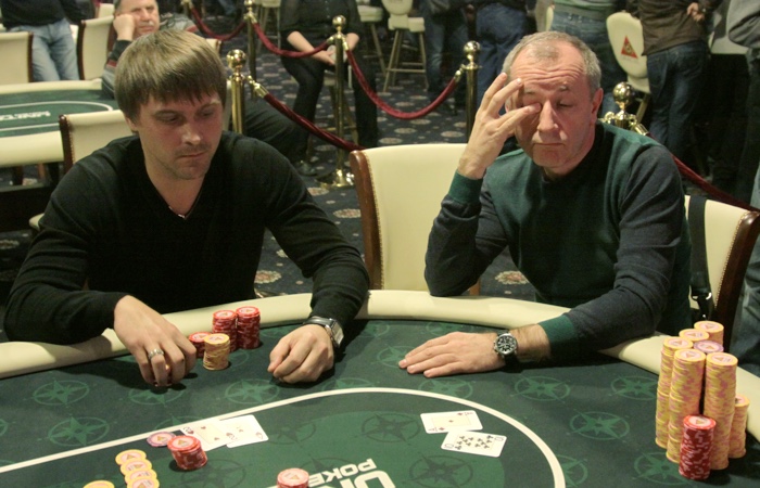 Евгений Уваров, который делал префлоп-рэйз из УТГ сказал чек, Владимир Булгаков из средней позиции тут же двинул олл-ин на 115К. За ним то же самое сделал Рафик Саркисов - на 174К. Уваров задумался. "Ваше решение?" - неожиданно спросила его дилер. - "Я считаю стеки..." - в задумчивости ответил он. А потом махнул рукой, и глядя на то как вокруг собирается толпа, коллировал. Открылись: