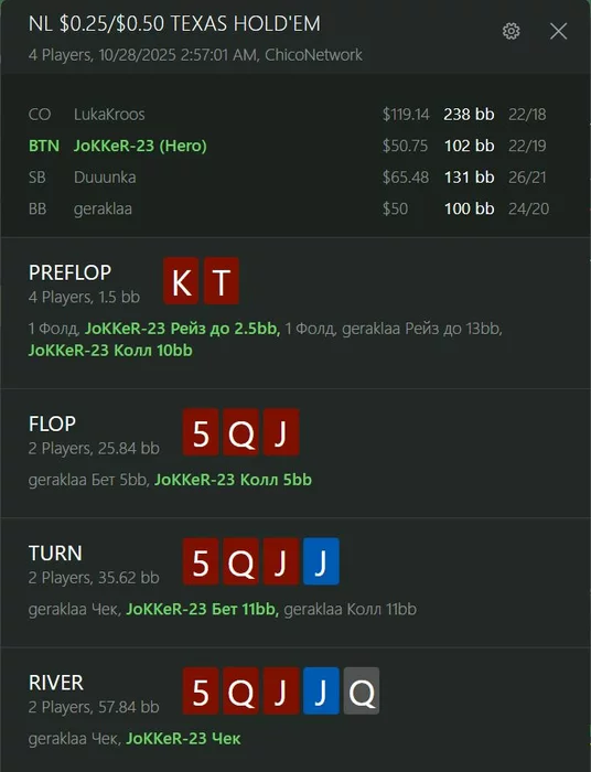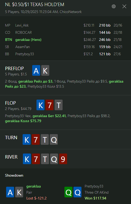 Нажал кнопку закрыть столы, половина закрылась, на одном из оставшихся эта раздача с регулярным пассивным фишом 27/6 3bet 2.5, винрейт у него от -25 до -50бб/100, играет стола 4, с ним мы играем много лет, у него есть степень по инженерии даже, вчера только узнал. Я в чате ему написал "nice bluff", на что он мне ответил: "i didnt bluff, just didnt put u on AK". Вот почему важно разговаривать с фишами в чате, они обьясняют логику своих действий обычно, что для нас очень полезно, очевидно.