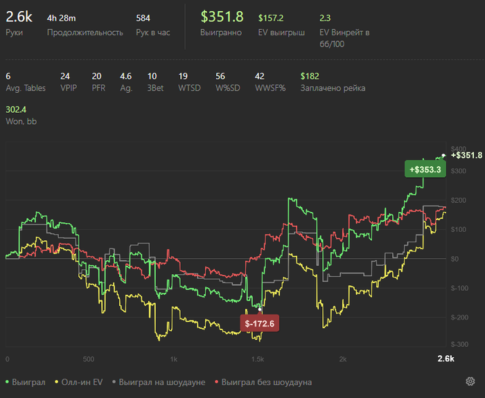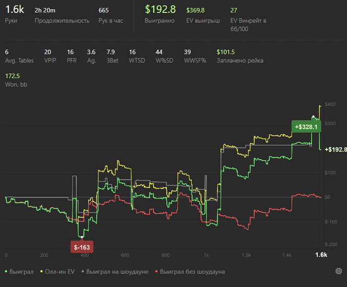 Столы сегодня временами были от просто отличных до охеренно-невъебенных, когда заканчивал, они ближе ко второй категории были, но я уже залипал в экран, поэтому закончил. И мне сегодня реально не везло, за счёт постфлопа и наживал, в тузов въехал префлоп раза 3-4, мои же получили 0 оплаты в префлоп олынах. И я сегодня одного нулевого фишерега так достал, видимо, что он начал на каждое моё открытие ставить кликача в позе, правда, ему это не помогало, он всё равно не знал, что с этим моим всем ренжом дальше делать на постфлопе 🤔 Сам я сегодня тоже поошибался, но ничего прям критичного, играл точно не в тильте, просто временами просаживалась концентрация.
