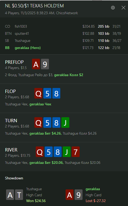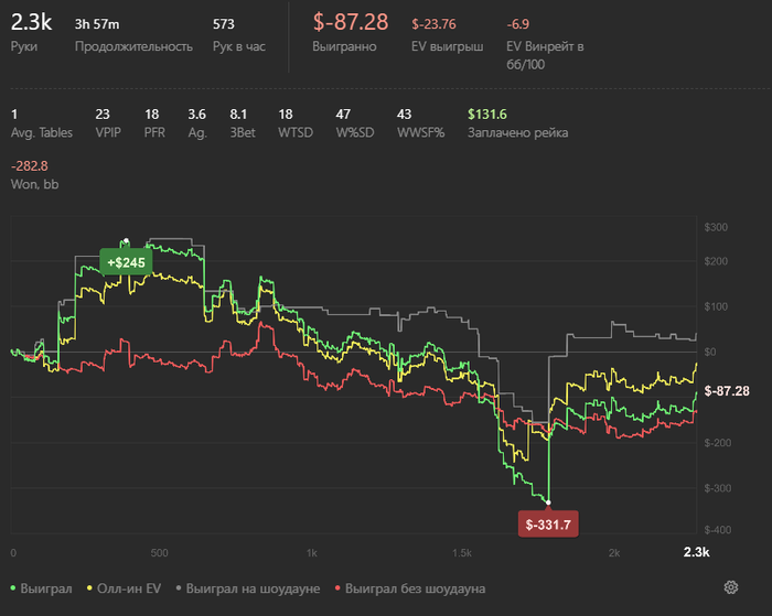 Хорошо поиграл, сегодня много экпериментировал, без ошибок не обошлось. Начал много блефовать в фишей, но тут на тёрне ошибся с сайзом, сразу овербета надо было наваливать, но колл его всё равно прикольный, он видел мою руку, не иначе, ну или ждал ещё одну карту, шестую 😗