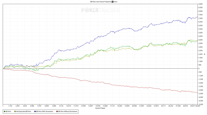 Просто уже весь год качу в +3К профита за почти 9 месяцев... это я в фонде, я типа вырос. Эти 3К еще поделить надо пополам. Я уже устал от того что просто не вижу никаких денег с покера в этом году. Вот на отпуск пришлось истратить весь накопленный рейкбэк который хранился на накопительном счету 550$ , и который копился к новому году, а сейчас сидим на подсосе после отпуска. И это при том, что с мая у меня просто лучший для меня график по винрейтам за летние месяцы. На 90К рук с фильтром ББ>499 и стэк 0-50ББ все лето отыграл в +7,6ББ/100 по ЕВ. А без фильтра +10ББ по ЕВ, да в ранних можно намного лучше, но не минусую же и главное в дипах показываю норм винрейт. Я не знаю уже что это... диспа или я сам.... в том же году ну почему то получилось шикарный для меня профит набить за год, рекордный для меня. А в этом году я не играю хуже чем в том, это точно. ХЗ. Но каждый алл-ин в ICM это как будто приговор, каждый терн и ривер когда у меня не натс с флопа как будто норовит прийти максимально говенным и максимально все испортить мне.
